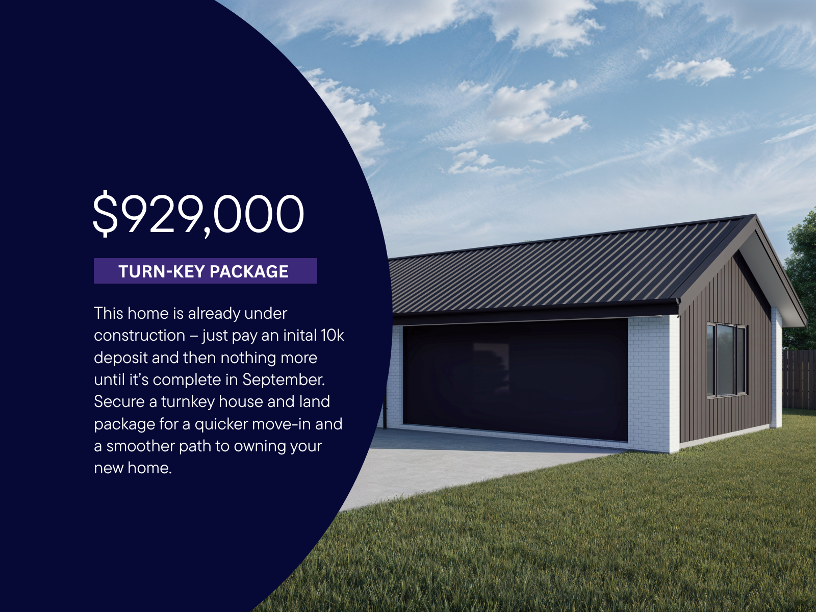 With this turnkey package, the path is simple — a $10,000 deposit now and nothing more until completion. No progress payments. No surprise costs. Just move in when it’s ready.